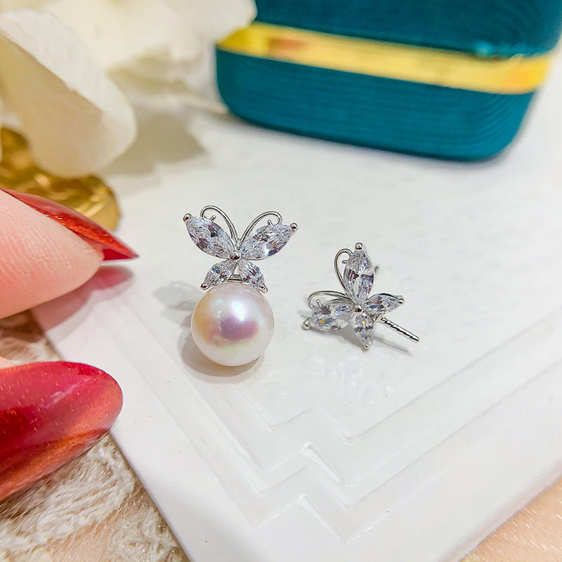 S925 Silver DIY Pearl Accessories 7-10mm Beads Butterfly Stud Earrings with Empty Tray 20940 Fashionable Jewelry