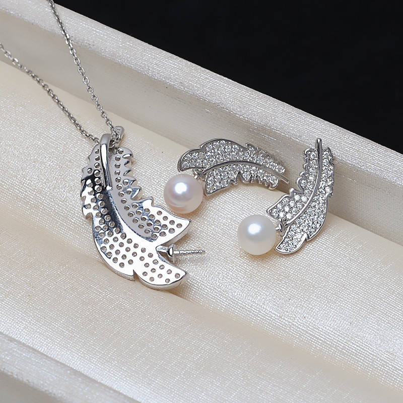 S925 Silver Feather Pendant Earrings Ring Set DIY Accessories for Female 5-6-7 Fetal Hair Pearl Empty Holder Fashion Jewelry