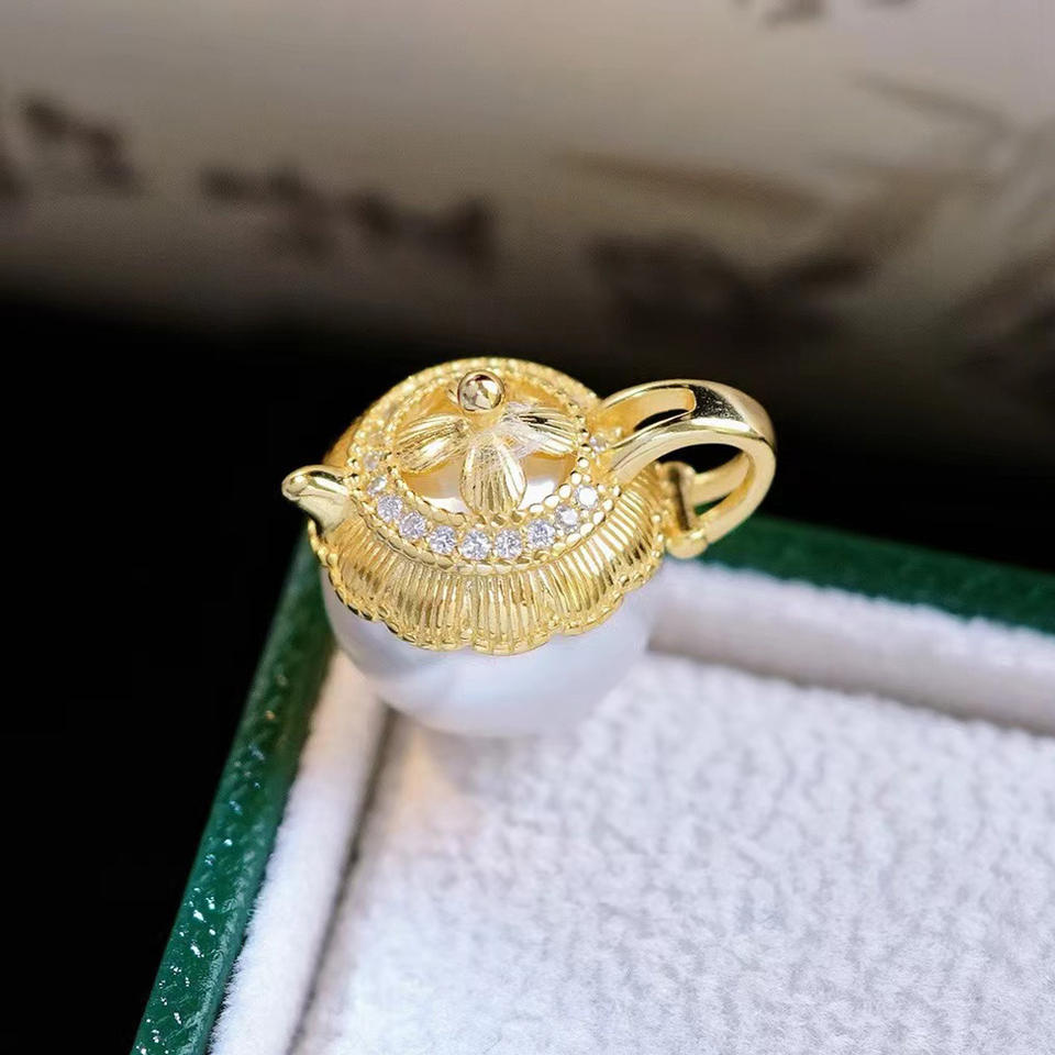 S925 Silver Pendant 12-14mm Round Beads DIY Pearl Accessories Empty Teapot Style Jade Necklace Pendant 31125