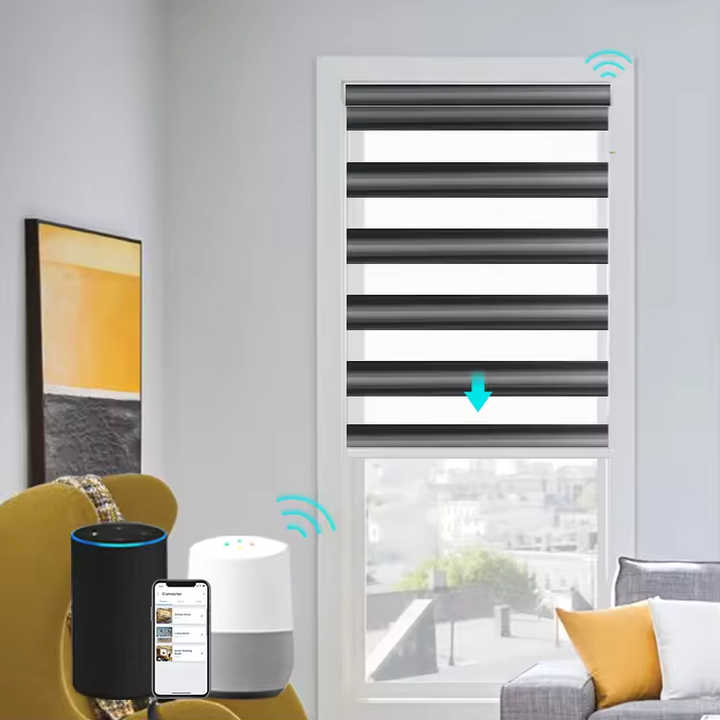 Stores zébrés sur mesure SAMADHI, stores occultants classiques à commande électrique, stores zébrés intelligents pour fenêtres