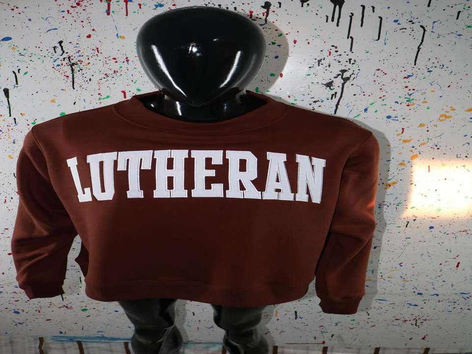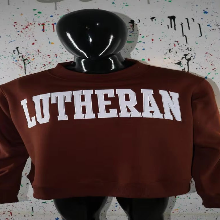 Sweat-shirt à col montant LUTHERAN BROWN 100% blanc avec broderie appliquée, col large, CLUSH SPORTS
