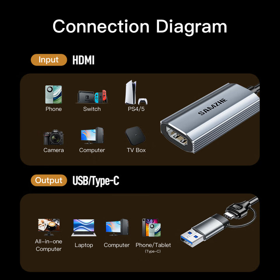 Carte de capture vidéo SAMZHE USB 3.0/Type-C vers HDMI, entrée 4K pour PS5/NS, téléphone, caméra, jeux, streaming en direct, enregistreur, dispositif de capture 2K