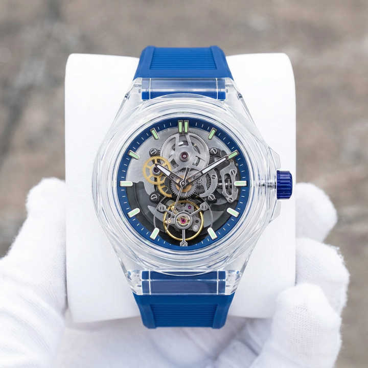 Montre automatique pour homme, boîtier en plastique, bracelet en silicone bleu, entièrement squelette, transparente, avec logo personnalisé, faible MOQ, OEM, ODM.