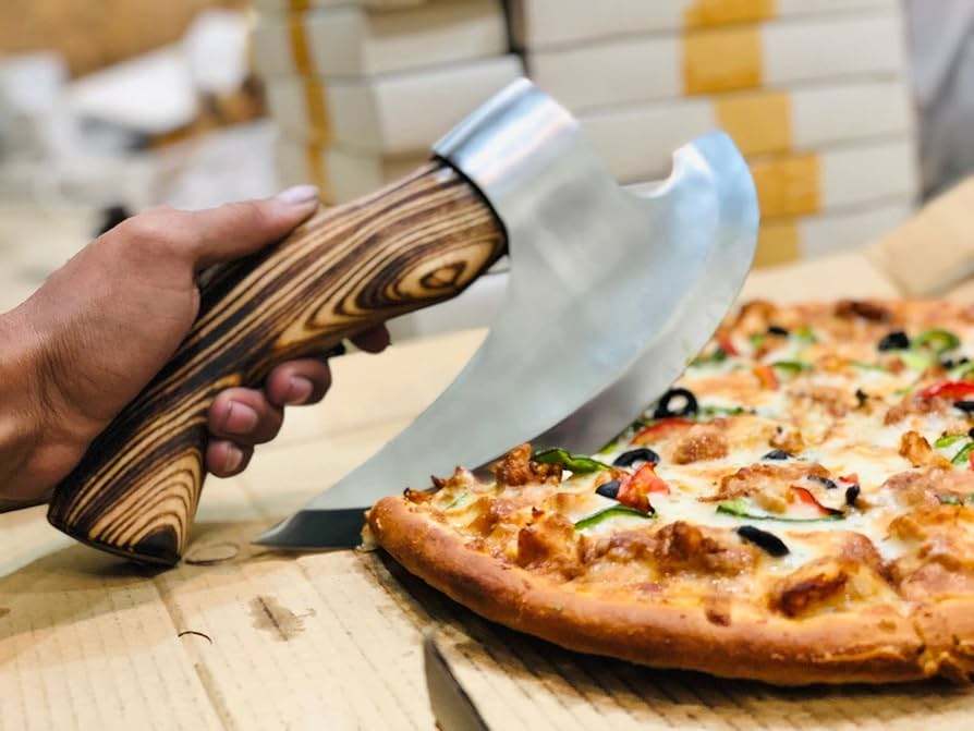 SCL personnalisé fait à la main en acier damas coupe-pizza hache personnalisé extérieur et coupe-pizza couteau de cuisine coupe-pizza hache