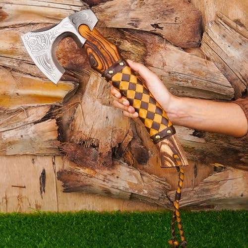Hache SCL - Mini hache viking forgée à la main de 14 pouces avec manche en bois de frêne, avec revêtement en cuir multi-tons, nouvelle tête de hache gravée