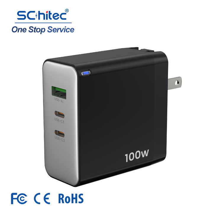Chargeur rapide GaN SChitec 100W avec lumière LED, multi-ports, super vitesse de charge, 2C+A, pour ordinateur portable et charge de plusieurs appareils.