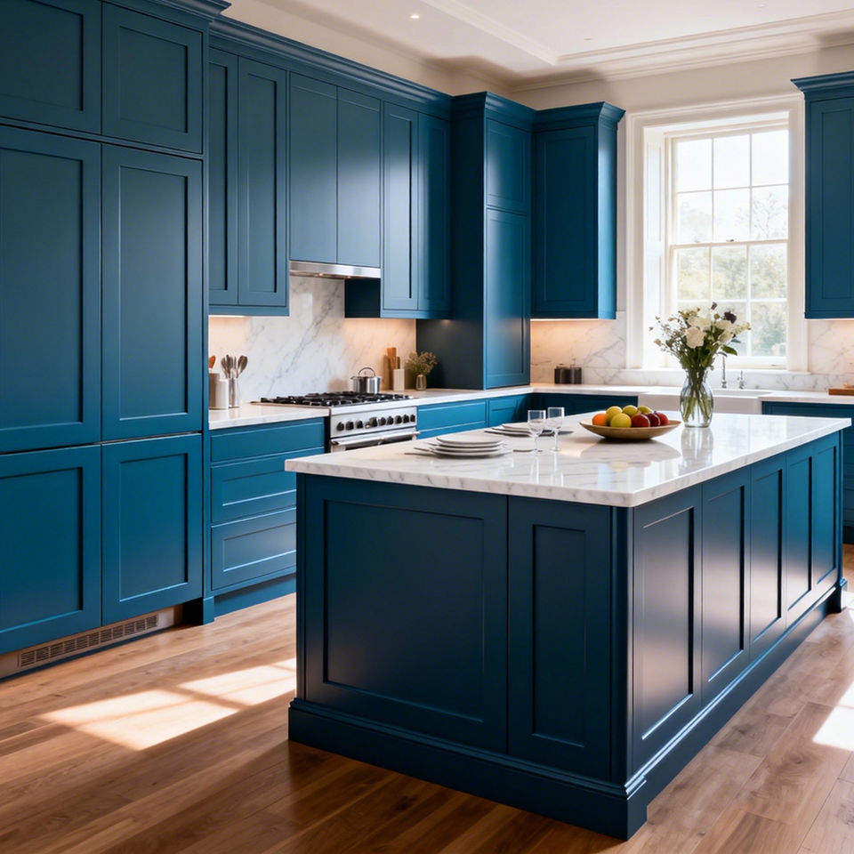 Cuisine ouverte SEA, armoire modulaire du sol au plafond, design moderne minimaliste écologique, bleu mat, construction en panneaux de mélamine