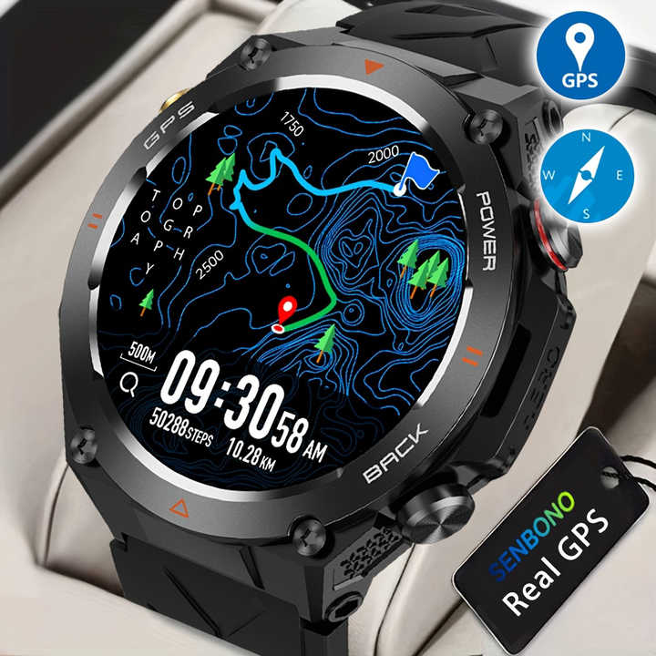 SENBONO Montre Connectée GPS Homme Écran HD 1,45'' avec GPS Intégré, Altimètre, Baromètre, Boussole et Commande Vocale IA, Compatible Android et iPhone
