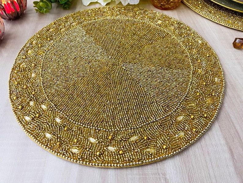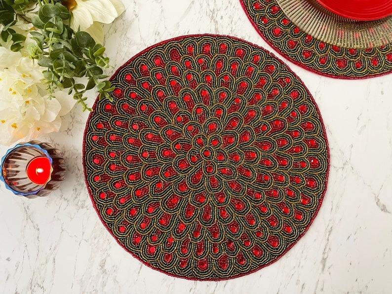 Ensemble de sets de table ronds brodés faits à la main avec des feuilles bleues perlées, élégants, écologiques, de luxe, pour les mariages et les événements