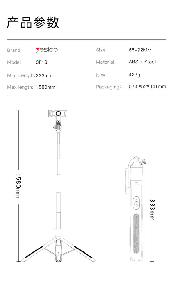 SF13 YESIDO Max Trépied Perche à Selfie 1,5 Mètre avec Support Téléphone pour Diffusion en Direct et Autoportrait