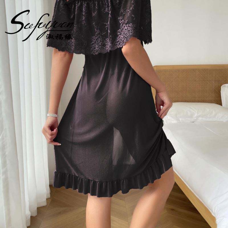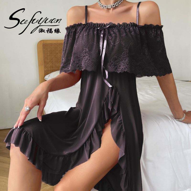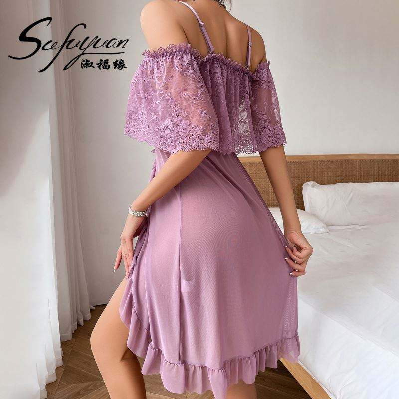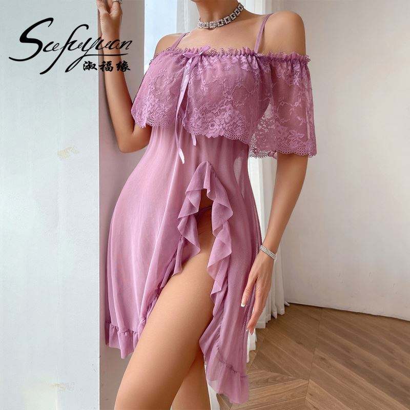 SFY-Y5136 Robe de nuit sexy pour femme en dentelle violette avec fente latérale et volants, sans bretelles, grande taille