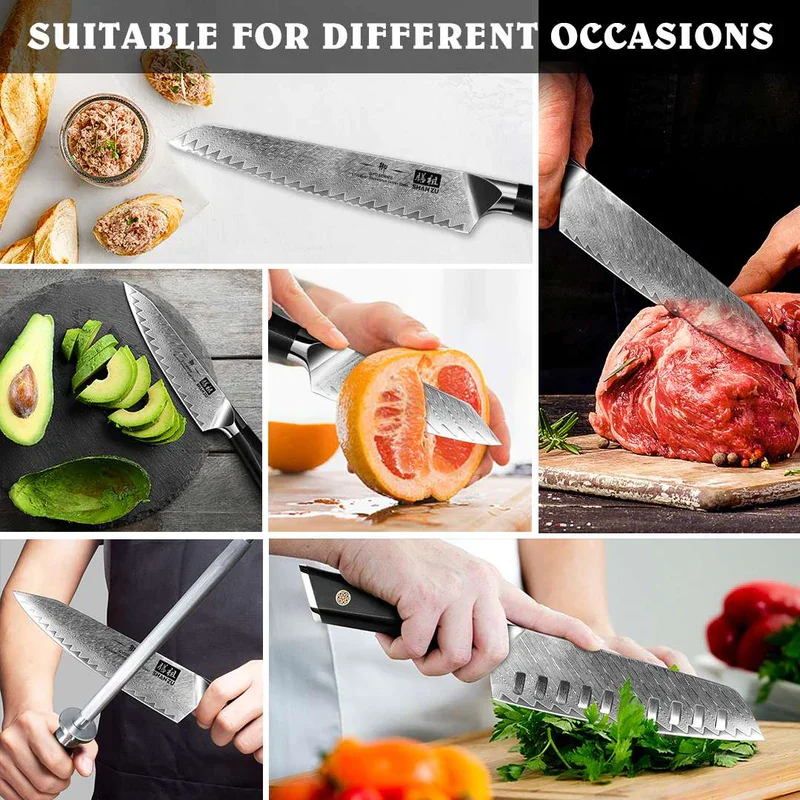 Ensemble de couteaux de cuisine SHAN ZU GYO série 7 pièces, acier japonais super résistant, acier damas, bloc de couteaux de chef avec manche en G10