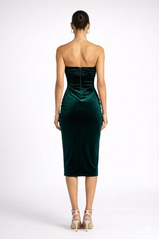 Robe de soirée mi-longue moulante en velours vert respirant, sans bretelles, froncée et fendue, confortable et naturelle, personnalisable OEM SHENGFU