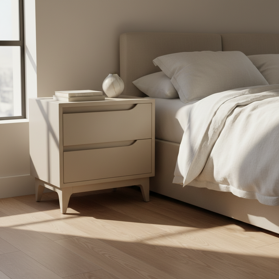 Table d'appoint/chevet moderne avec 2 tiroirs, en chêne massif écologique, design dynamique pour salles à manger et espaces de vie