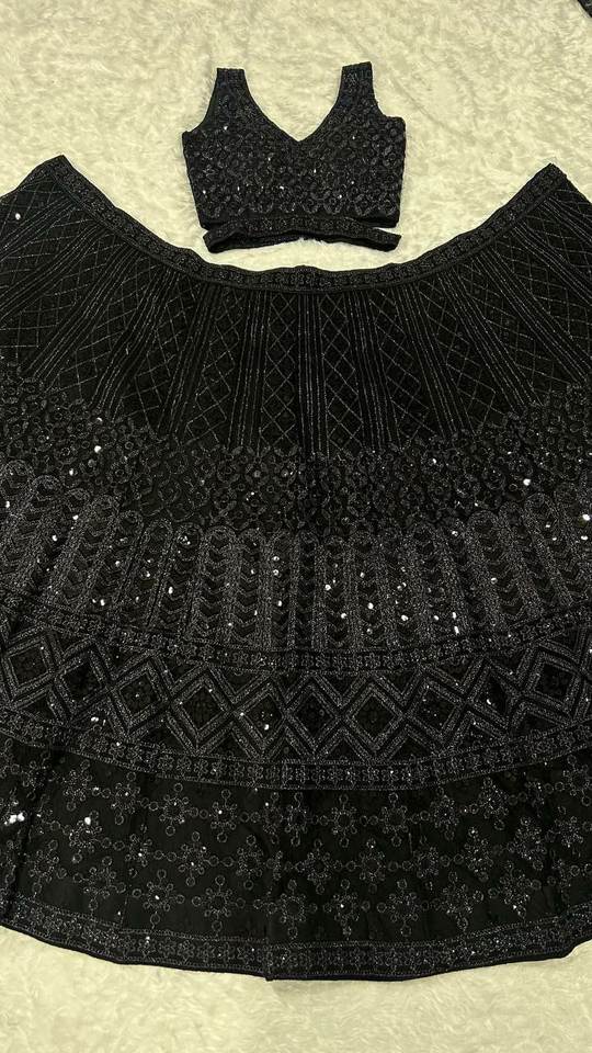 SIE présente un ensemble Chnaiya Choli / Lahenga noir très élégant, orné de motifs multi-codifiés et de sequins, idéal pour les défilés et les événements.