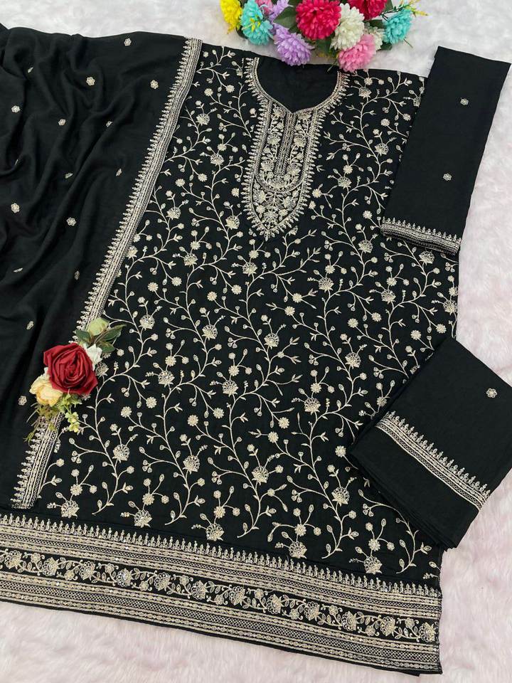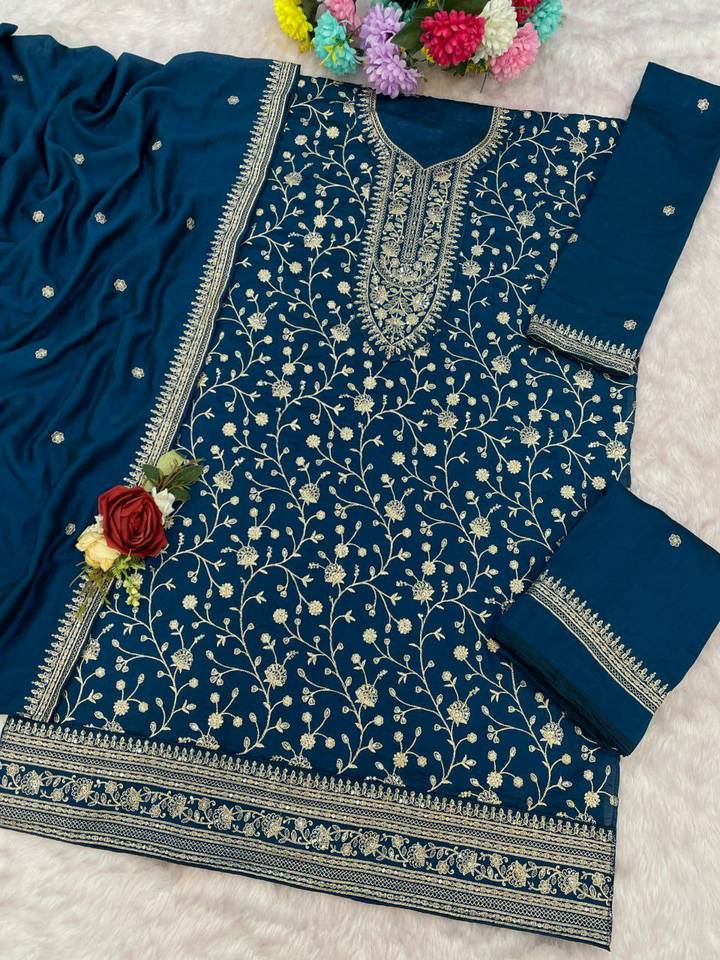 SIE présente un ensemble Salwar Kameez de créateur personnalisé et confortable en tissu de soie Vichitra de très haute qualité à fleurs épaisses avec dupatta