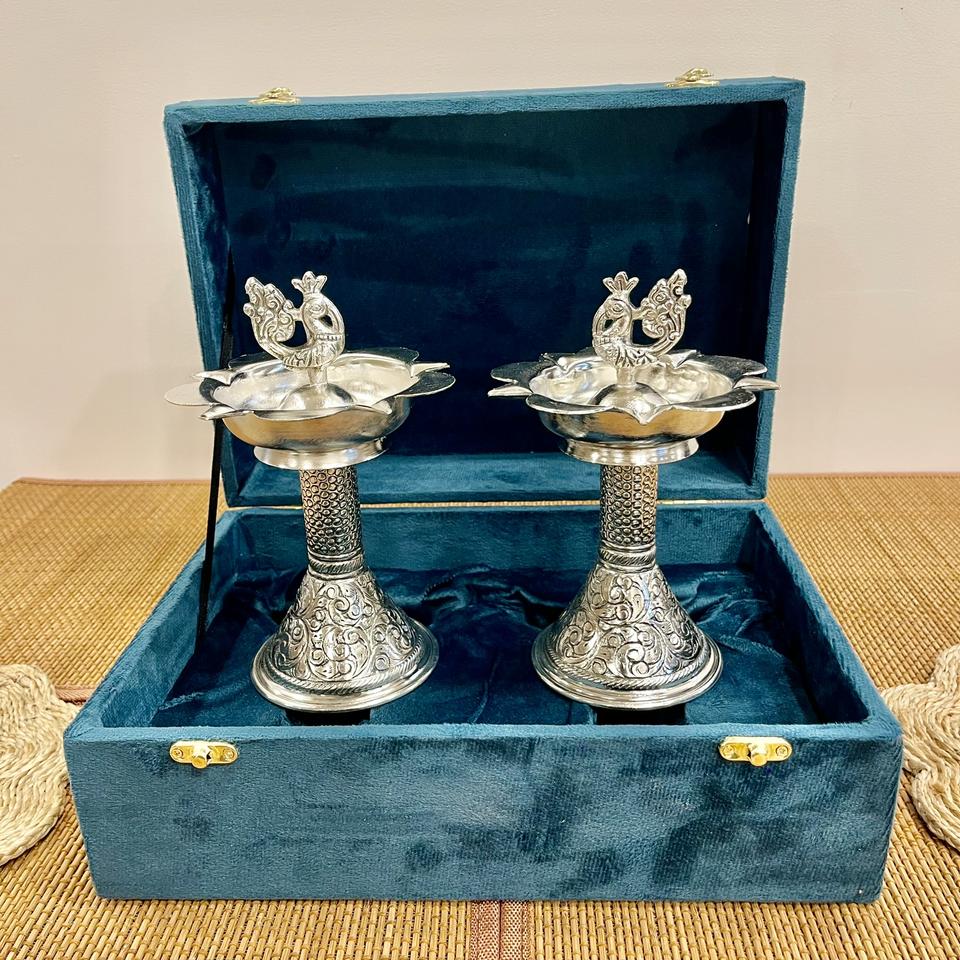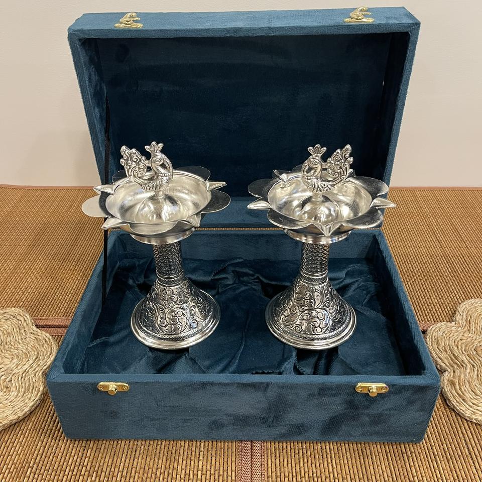 DIYA et lampe en argent plaqué, sculptés à la main, (PAIRE), petit modèle