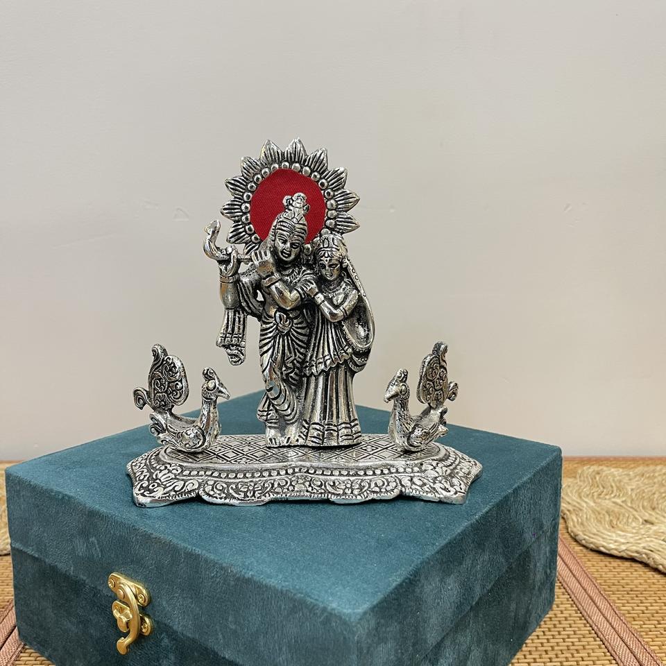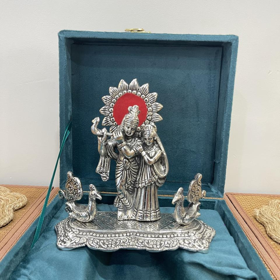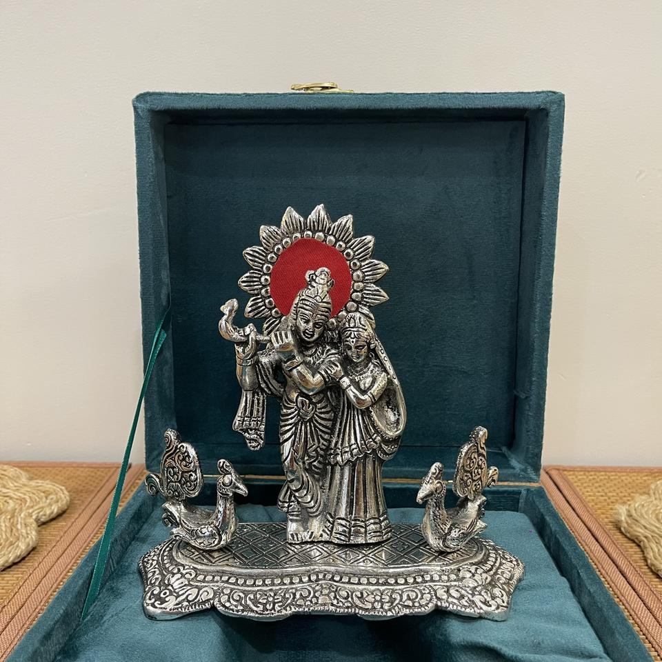 RADHA KRISHNA PLAQUÉ ARGENT AVEC PAON DÉCORATIF ET EMBALLAGE CADEAU