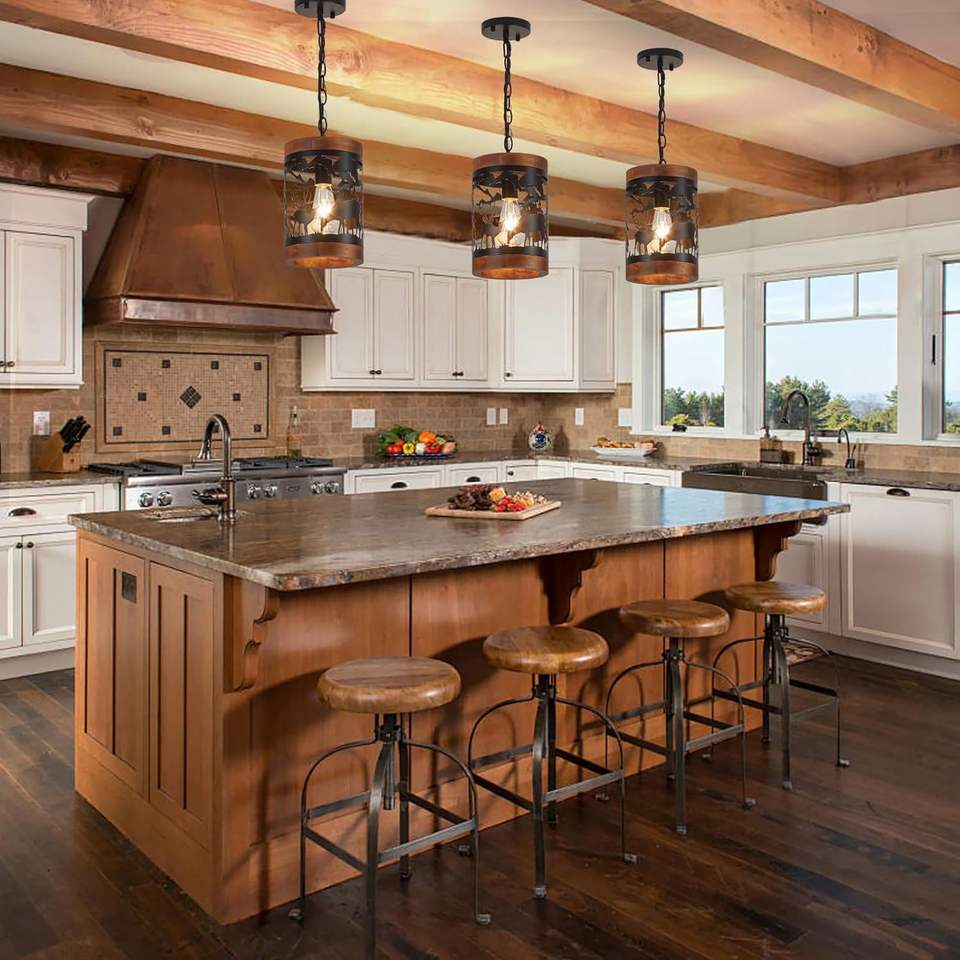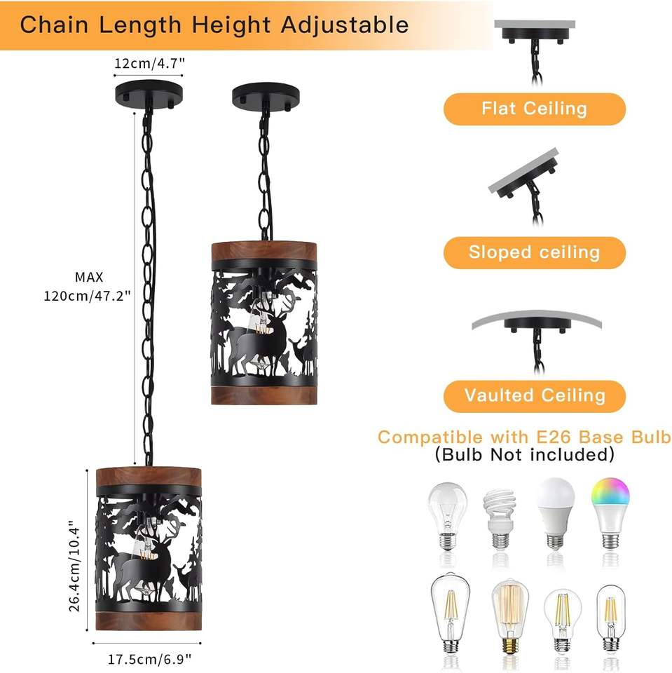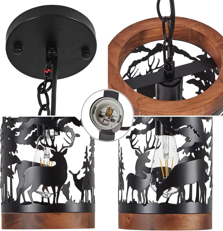 Luminaire suspendu rustique en forme de cerf SIMIG, 1 lumière, style ferme, bois et métal, luminaire suspendu réglable pour cuisine et salle à manger