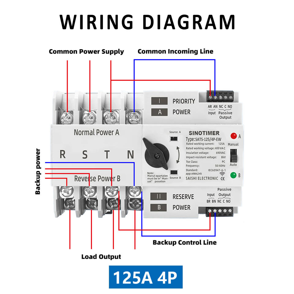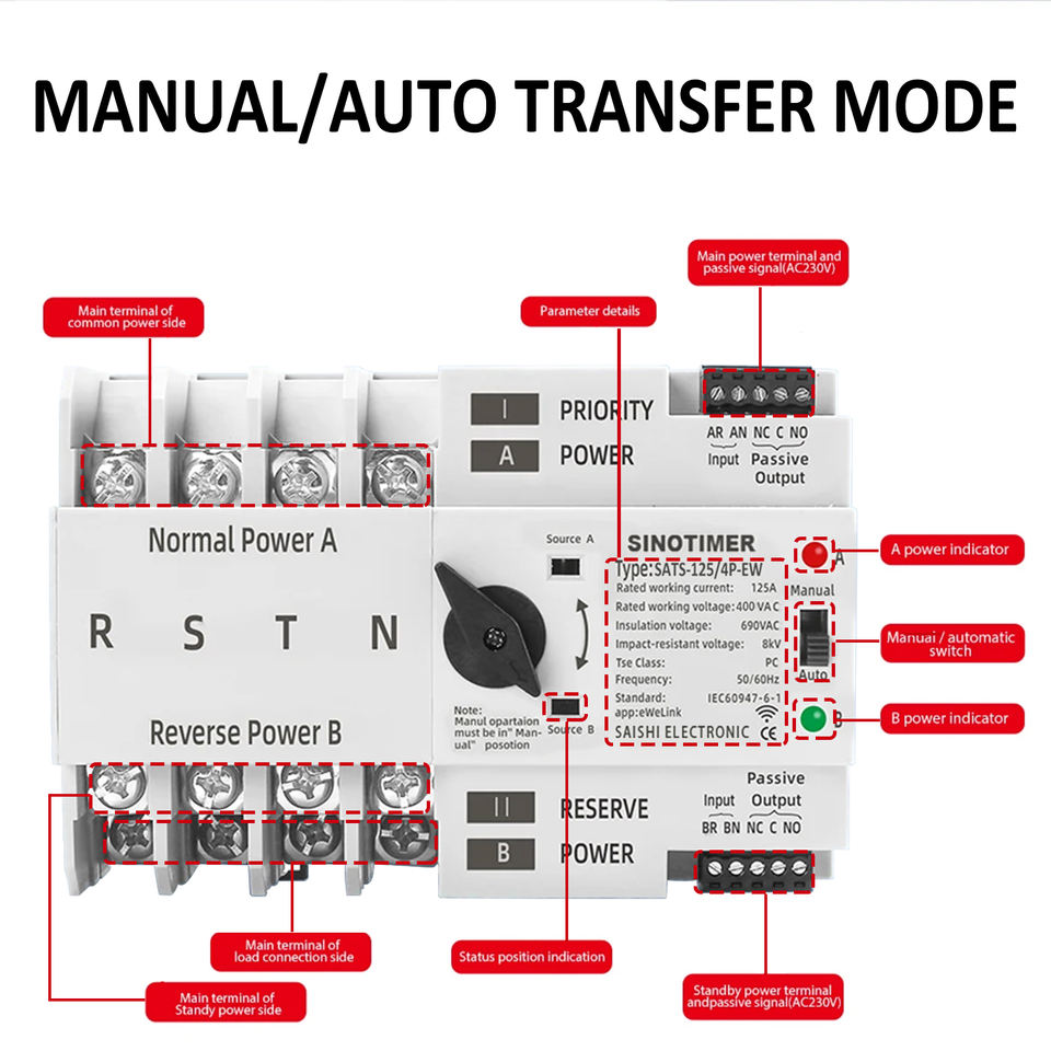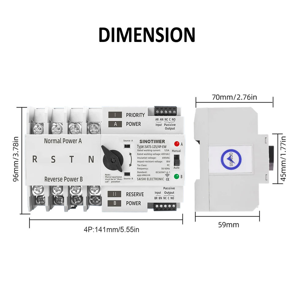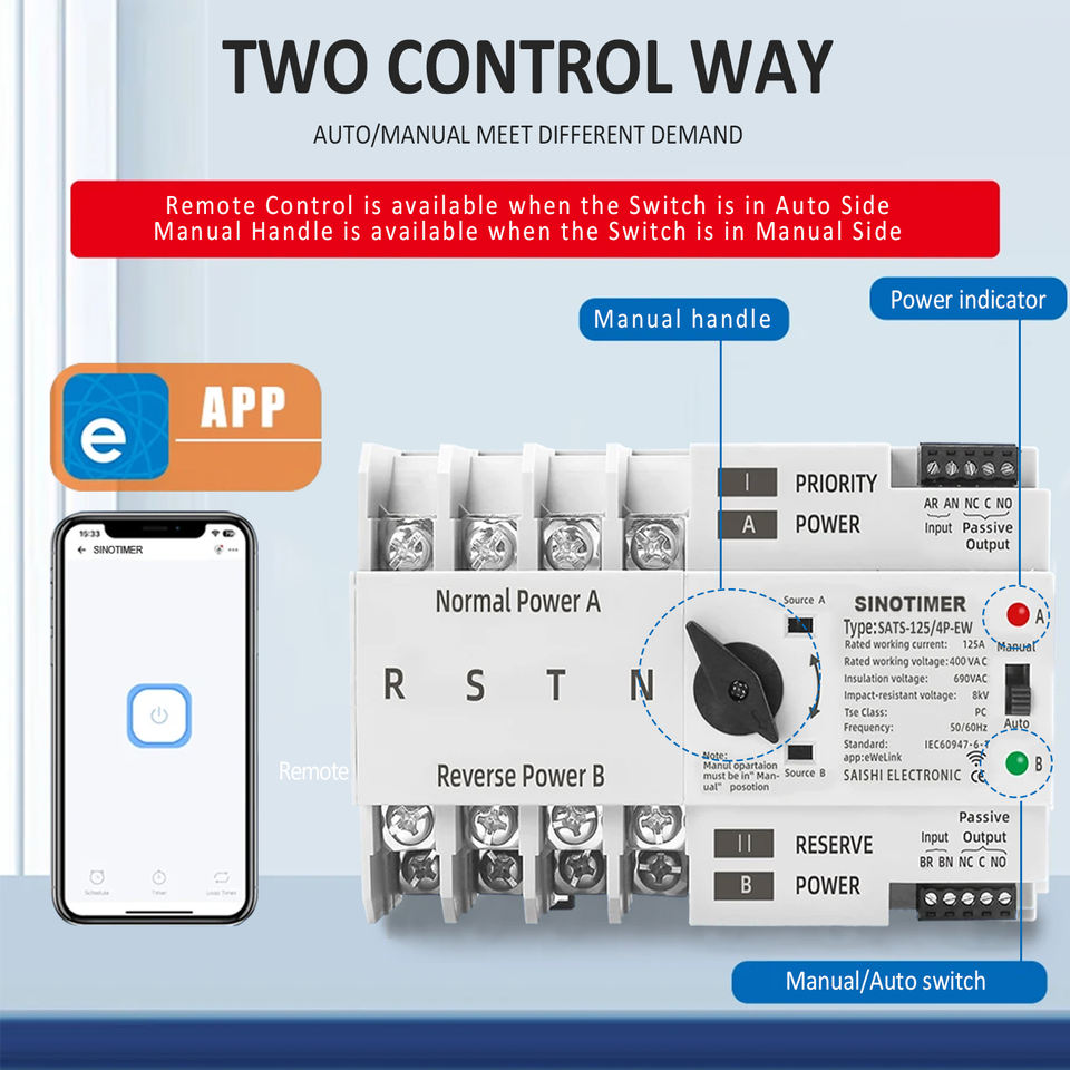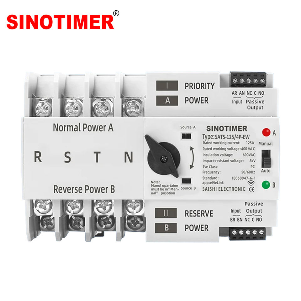 SINOTIMER SATS-125/4P-EW WiFi ATS - 125A 400V, Alexa/Google, commutateur <8ms, 4 pôles, commutateur d'alimentation de secours automatique/manuel, rail 35mm