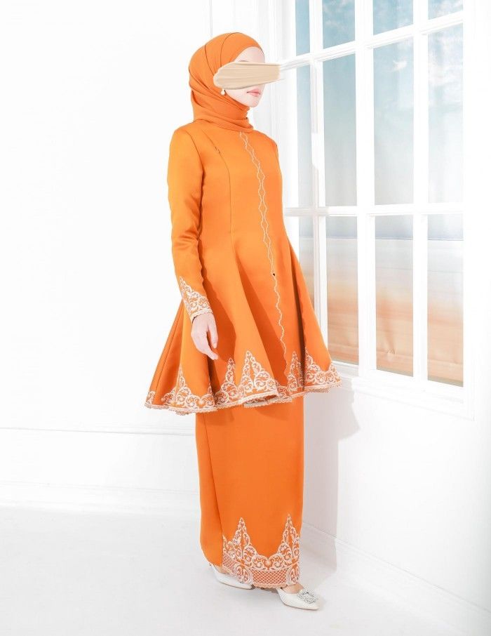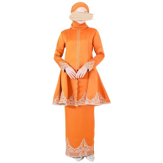 SIPO 2022 nouvelle robe malaise traditionnelle de haute qualité Polyester Baju Kurung caché avant fermeture éclair brodé Orange en ligne Kebaya