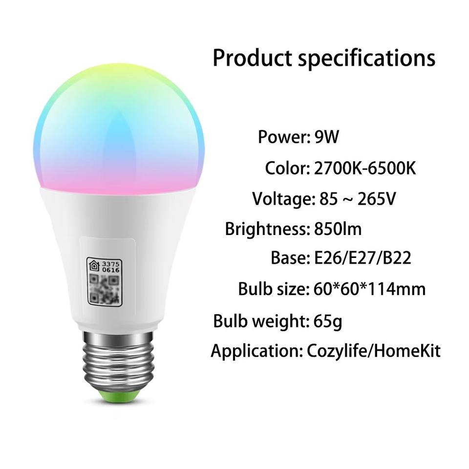 Ampoule connectée WiFi SIXWGH 9W HomeKit à changement de couleur, 16 millions de couleurs, blanc réglable (2700K-6500K), compatible avec Alexa/Google Home APP