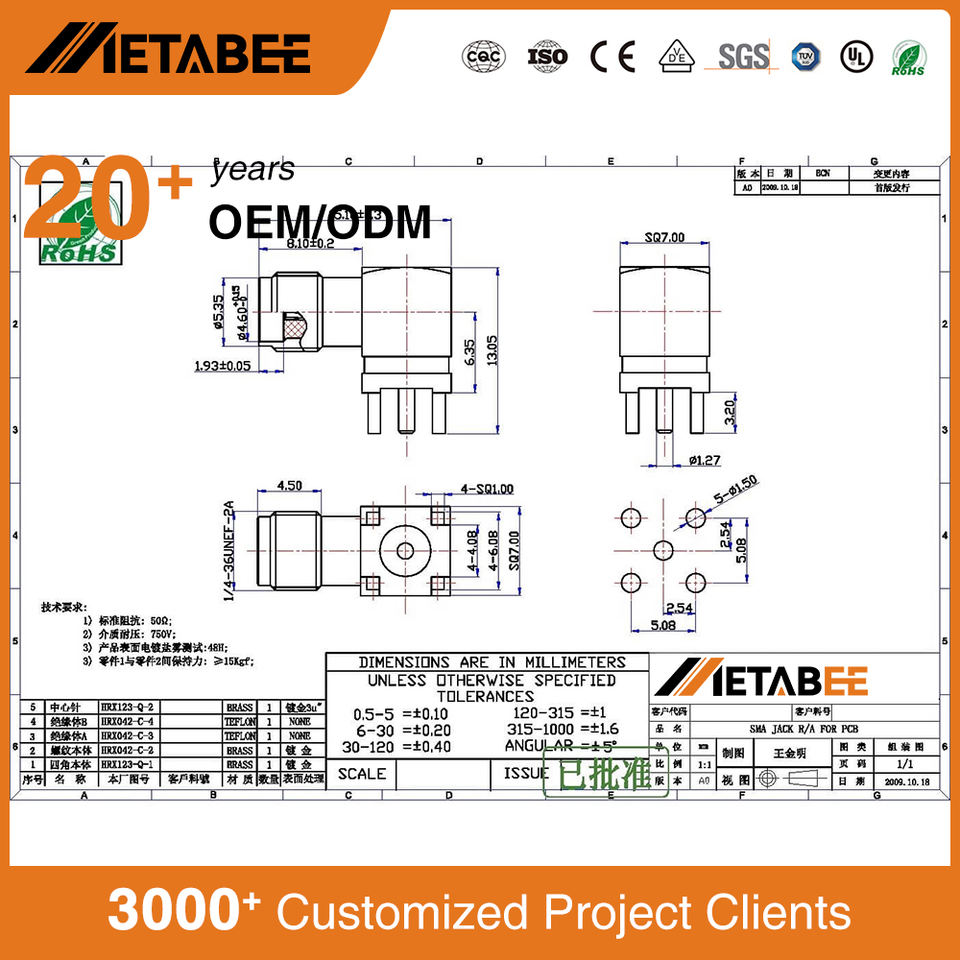 Connecteur RF SMA Série RP-SMA pour montage sur panneau PCB, à bride 2 ou 4 trous, et types à sertir ou à souder pour câble, 50 Ohms, mâle et femelle
