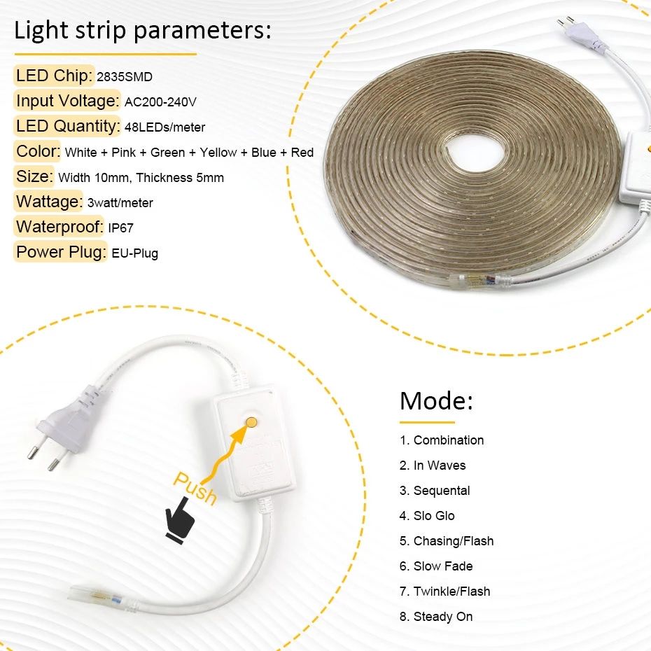 Bande lumineuse LED multicolore, smd 2835, 2835 V AC, 220V, 50M, ruban de lumière étanche, avec adaptateur européen, 8 modes