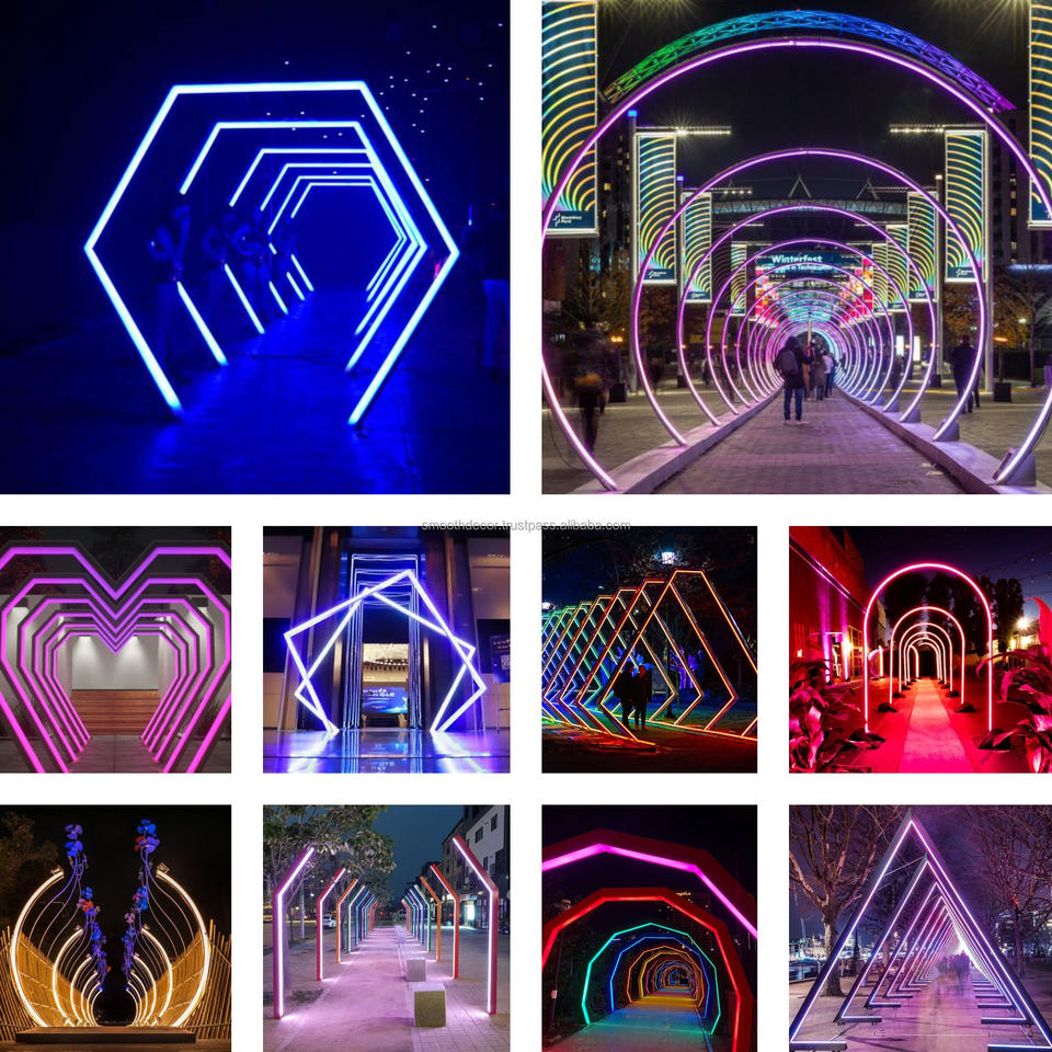 Arche d'entrée lumineuse géométrique effet tunnel pour mariage, en métal, avec éclairage LED néon
