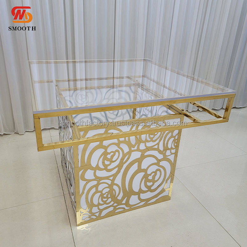 Table en métal à motif creux doré lisse pour les salles de réception de mariage, les événements d'anniversaire et les décorations de fête pour les hôtels et les salles à manger