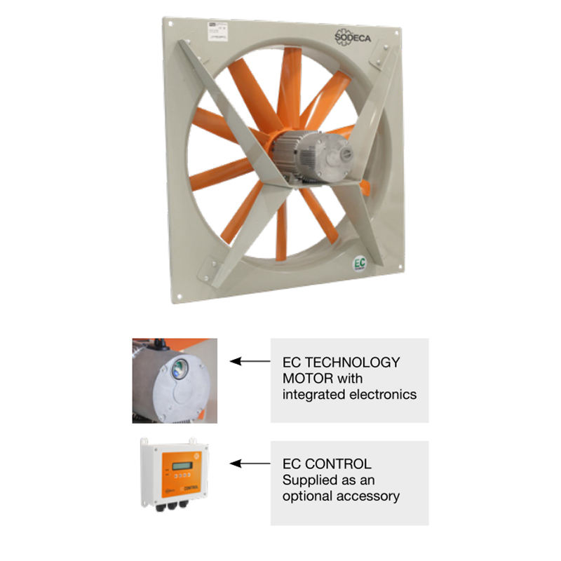 Ventilateurs axiaux muraux SODECA monophasés 220-277 V 50/60 Hz et triphasés 380-480 V 50/60 Hz pour une grande efficacité énergétique