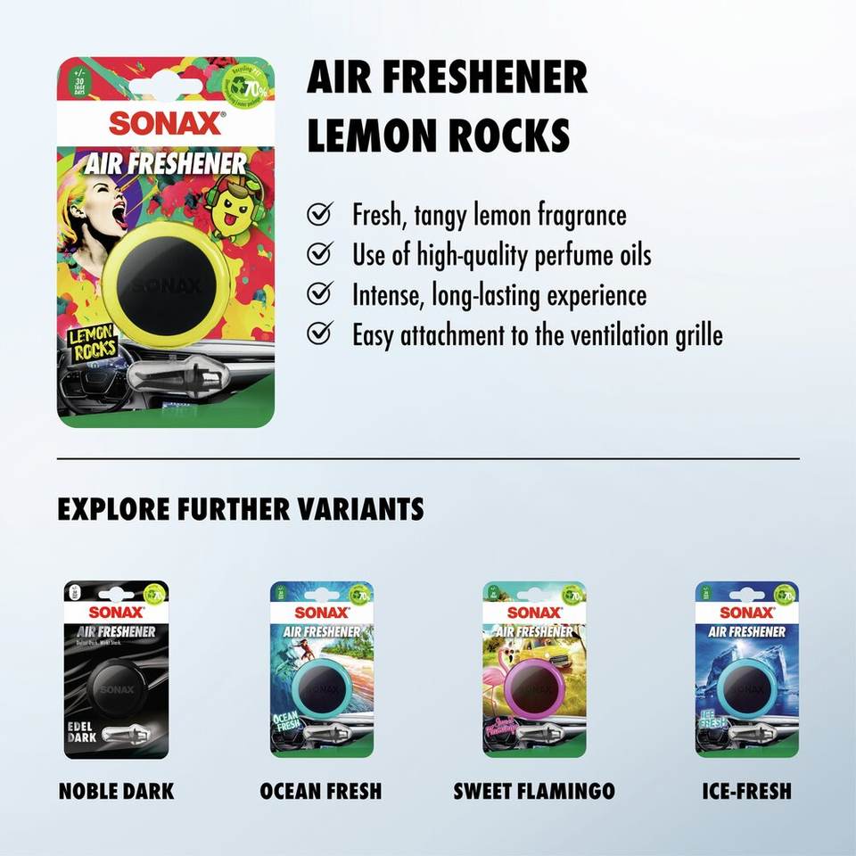 Désodorisant de voiture SONAX GmbH Lemon Rocks, 1 pièce, parfum agrumes énergisant pour usage automobile