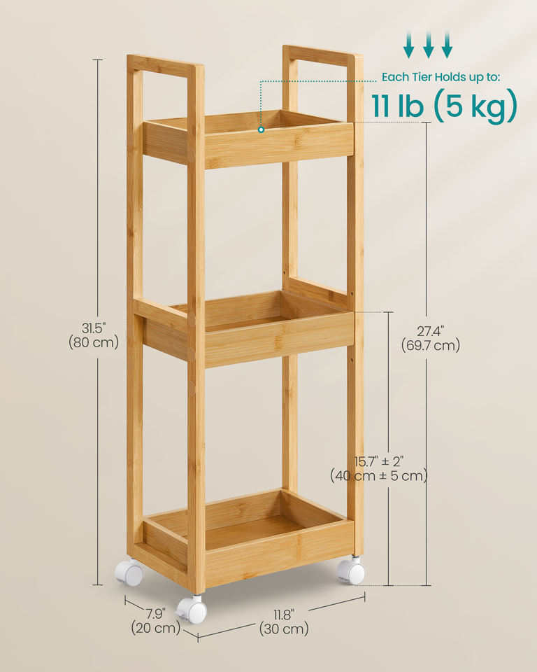 SONGMICS Étagère de rangement multifonctionnelle durable et écologique avec roulettes, 3 niveaux, en bambou, gain de place, pour salle de bain
