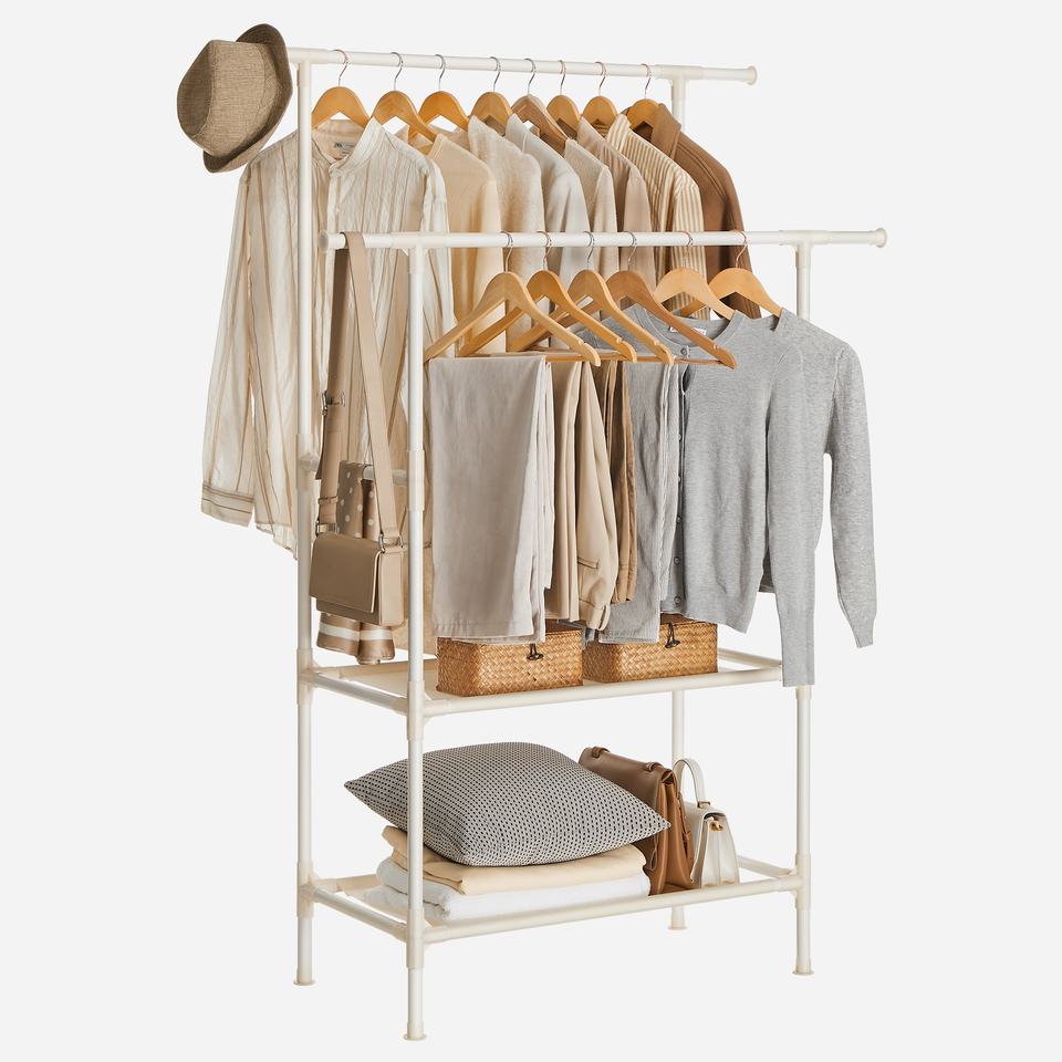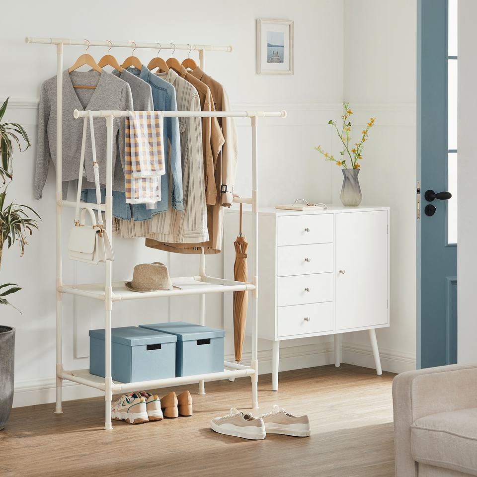 SONGMICS – support à vêtements en métal blanc, avec 2 Rails de suspension et 2 étagères de rangement