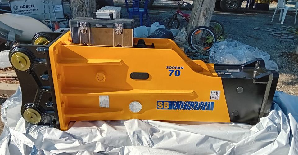 Casse-pierre hydraulique SOOSAN SB70 de type boîte, doté de fonctionnalités standard, comprenant burin, tuyau, boîte à outils, cylindre d'azote et garantie de douze mois.