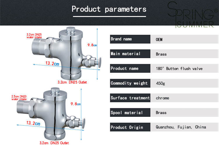 Vanne de chasse d'eau manuelle à bouton-poussoir pour toilettes, en laiton, avec temporisation, printemps-été