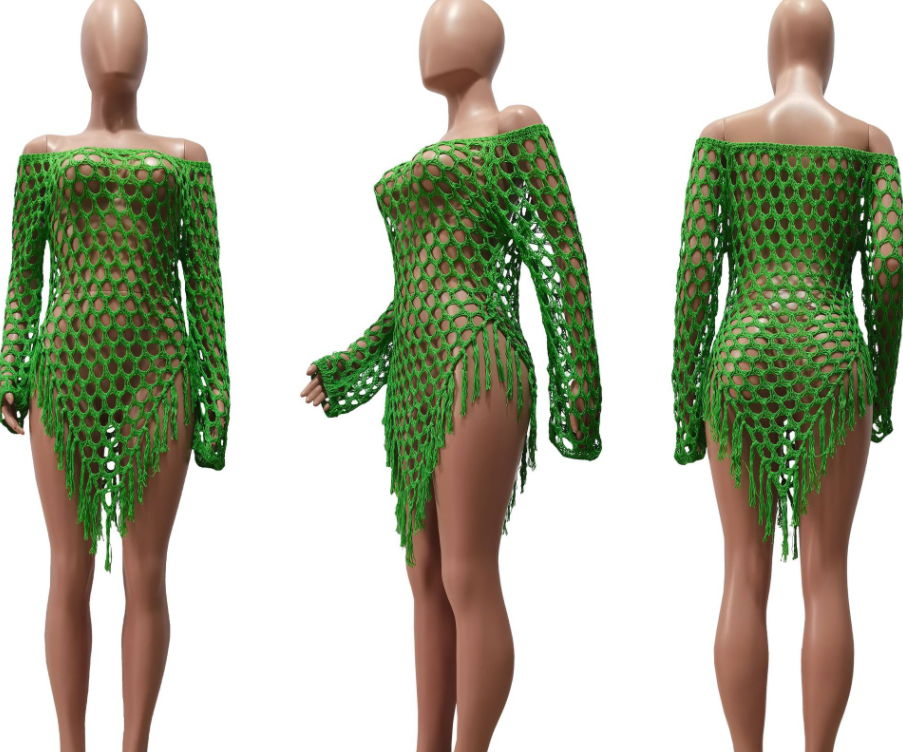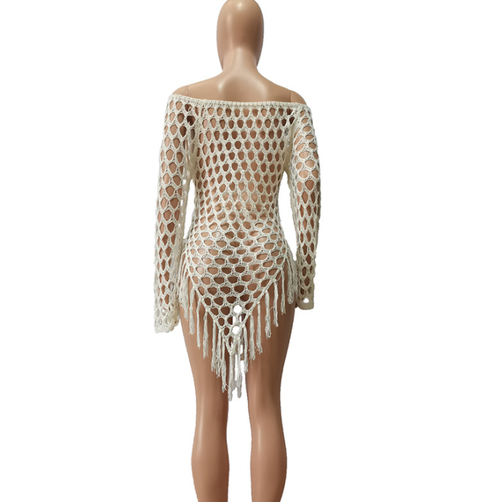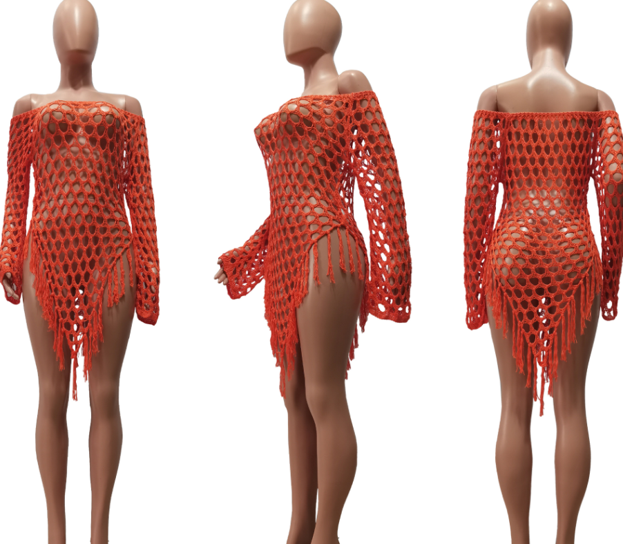 STOCK 5 couleurs hors épaule évider robe à la main Crochet plage couvrir franges voir à travers Caftan