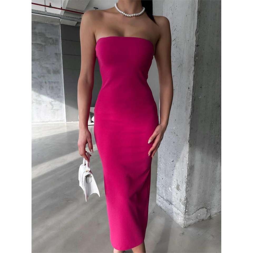 Robe de soirée bustier fuchsia en crêpe, taille XS et plus, longue, à sequins, avec motif à pois et taille basse