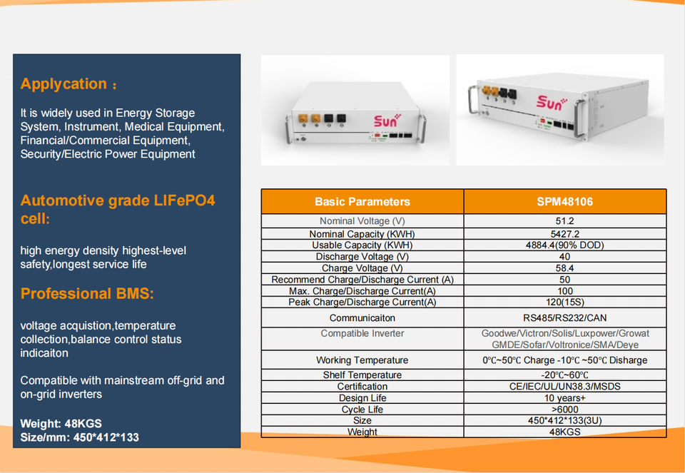 Cellule solaire SUNPLUS certifiée CE/UL 51.2V 6000 cycle de vie 10 ans durée de vie du système photovoltaïque