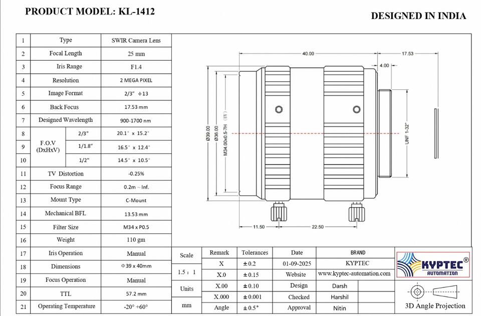 Objectif de vision industrielle, objectif de caméra SWIR