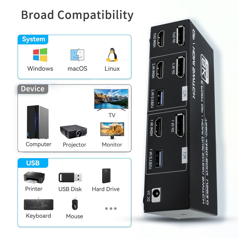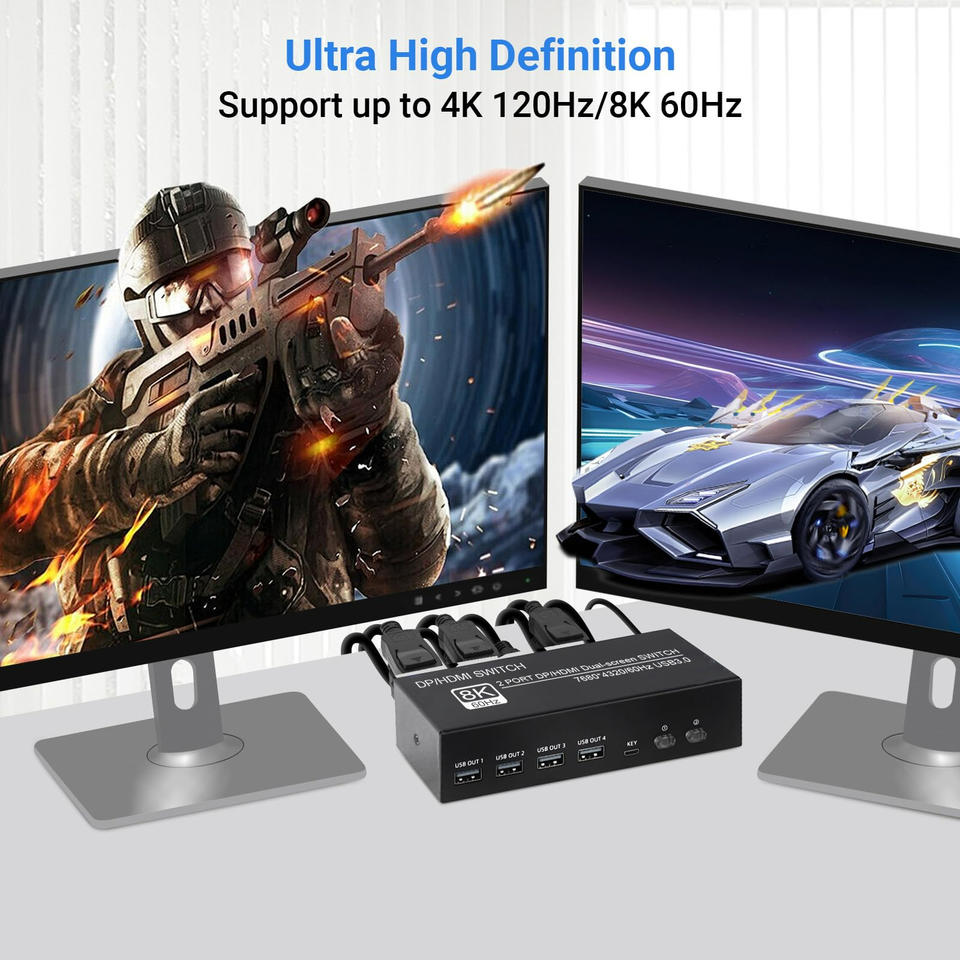SY 8K 2 ports DP HDMI Commutateur de moniteur à double écran Commutateur KVM DP HDMI 2 entrées 2 sorties 7680*4320/60Hz USB 3.0 avec clavier souris