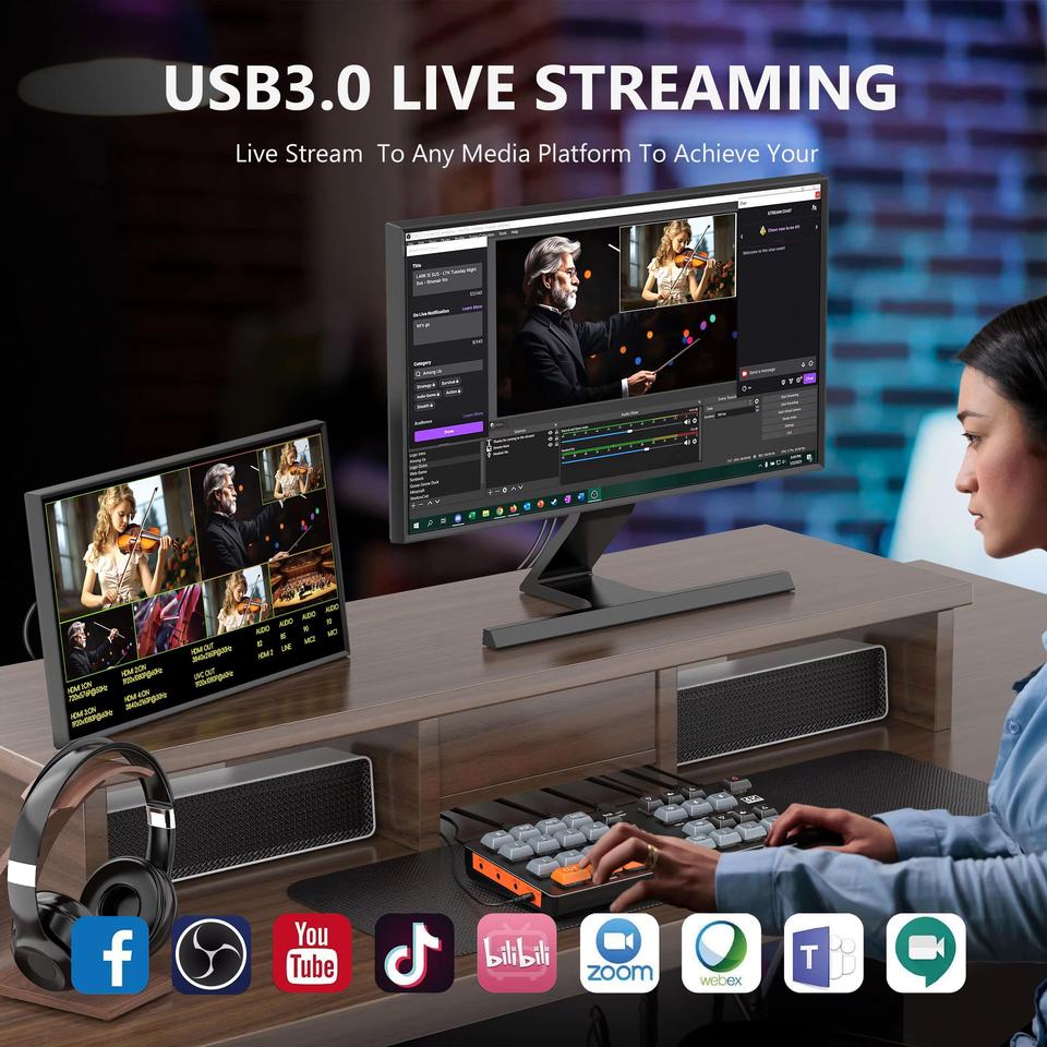 XSplit, Chrome, Skype, Wirecast, Safari, Encodeur en direct de médias Flash d'adobe, OBS, OS X, Xbox, PlayStation 4, Windows 10, Android 5.0 ou au-dessus, OBSStudio (fenêtres, OS X), Producteur réel Plus, VLC, PotplayerSoutien Systerm