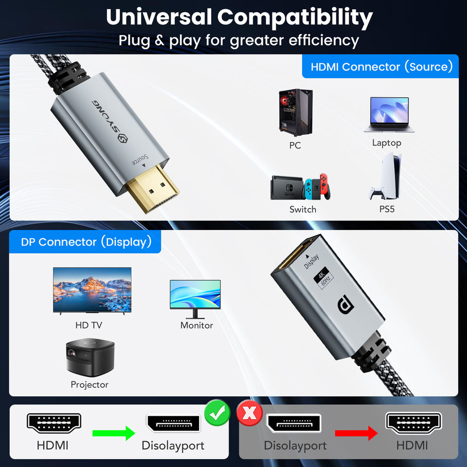 SYONG HDMI to DisplayPort Adapter,Unidirectional 4K HDMI Source(Input)to Display Port(Output)Monitor Video Cable USB Powered