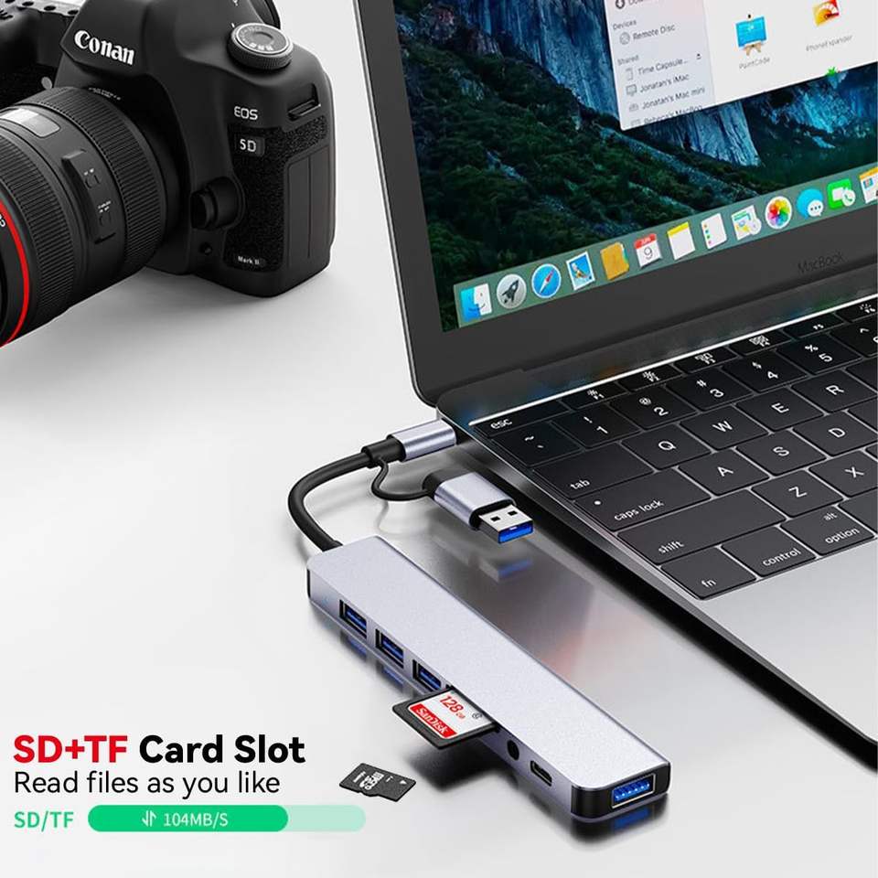 Hub USB C haute vitesse SYONG 3.0, répartiteur USB 8-en-1, extension USB avec 4 ports USB, port auxiliaire 3,5 mm, lecteur de cartes SD/TF, plug and play