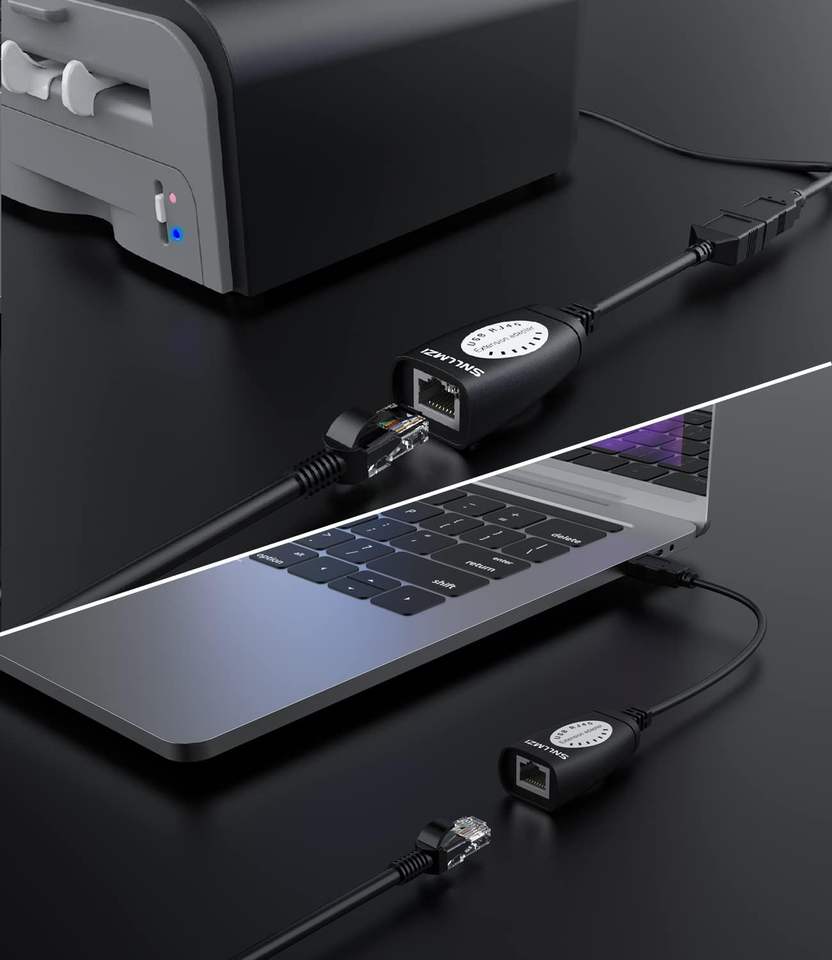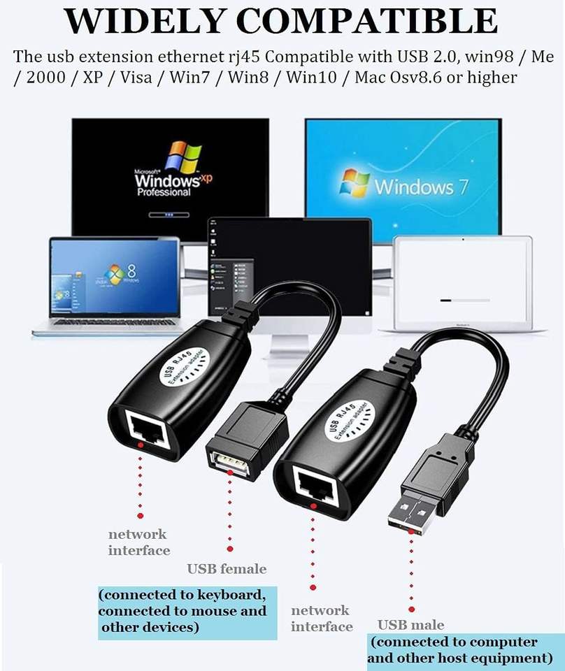 Adaptateur SYONG USB 2.0 vers RJ45, extension USB 50m sur RJ45 Ethernet Cat 6e/6/5/5e, Plug and Play, câble d'extension USB Rj45 noir