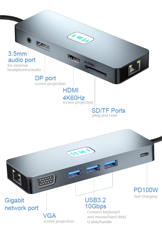 Type:USB3.2 * 3 + RJ45 + HDMI(4K @ 60Hz)+ DP(4K @ 60Hz)+ SD/TF + 3.5mmAudio + VGA + PD
