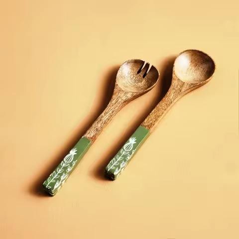 Ensemble de serveurs à salade en acier inoxydable, ustensiles avec revêtement PVD, manche en osier tressé