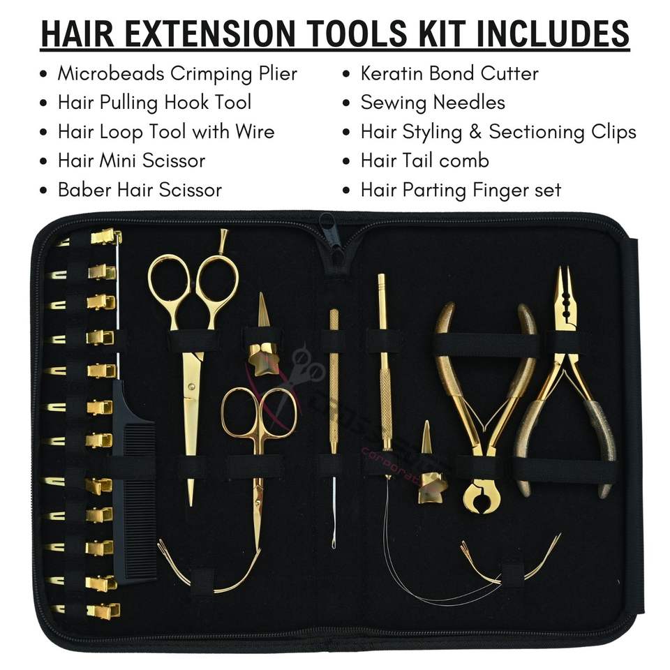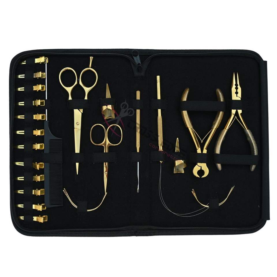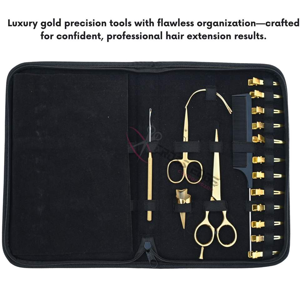 1 étui Kit d'outils d'extension de cheveux dorés avec acier inoxydable