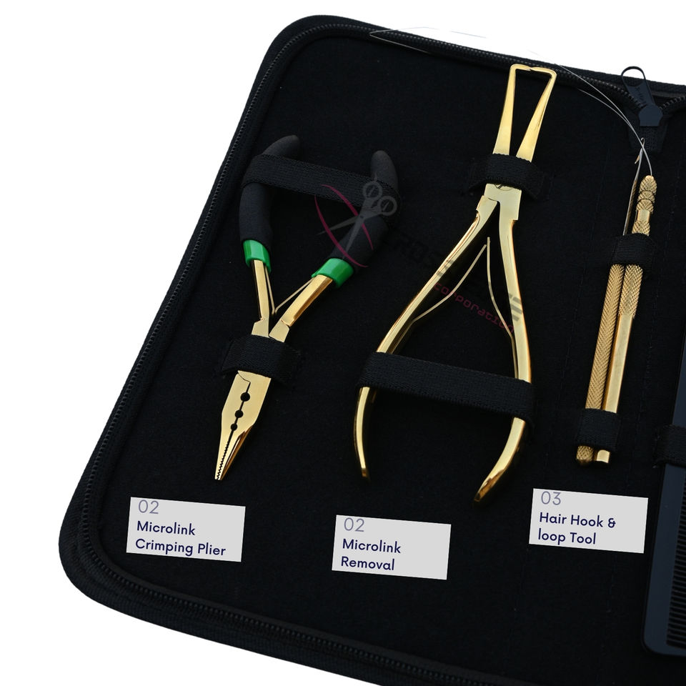 Kit d'outils pour extensions capillaires de salon : Pince à sertir 3 trous, Extracteur de micro-perles, Enfileur de boucles, Peigne à queue, Ciseaux miniatures pour séparation des mèches