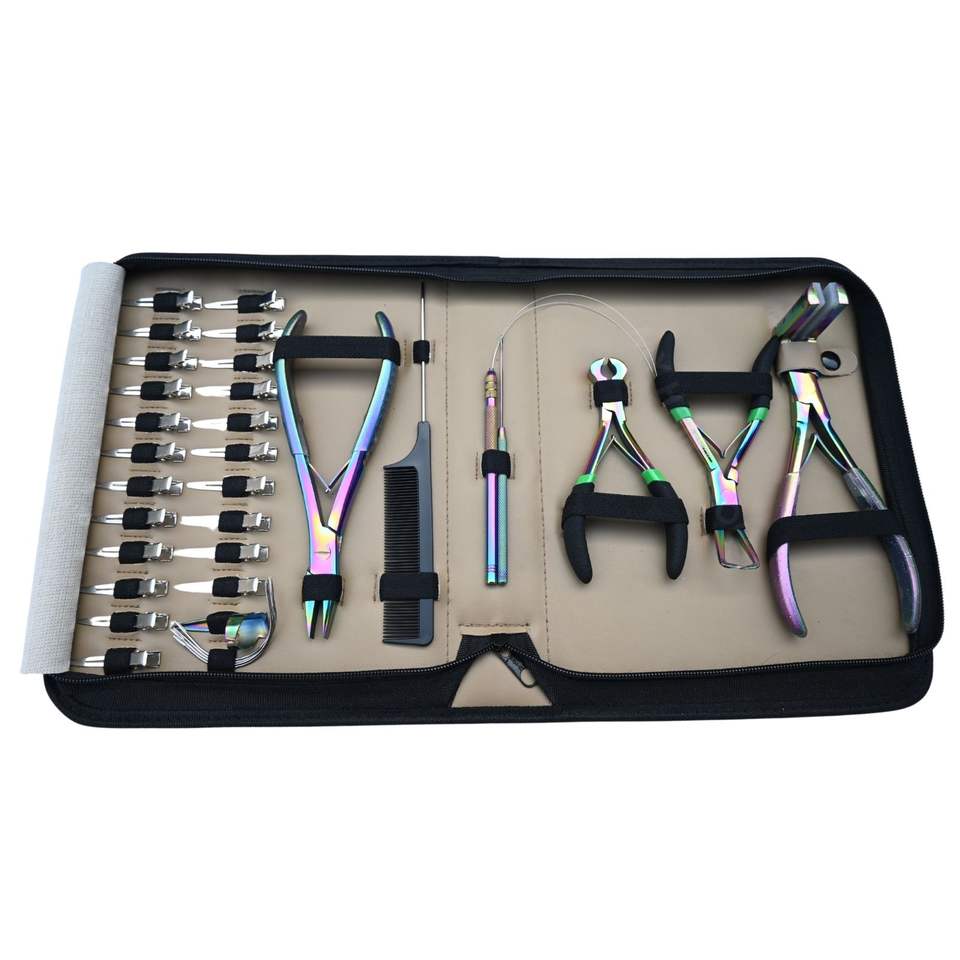 Outils pour extensions de cheveux de salon : Pince à clipser pour extensions à bandes, Pince à sertir plate, Démonte-perles, Coupe-extensions à kératine, Peigne à anneaux de séparation, Clips, Outil à boucles